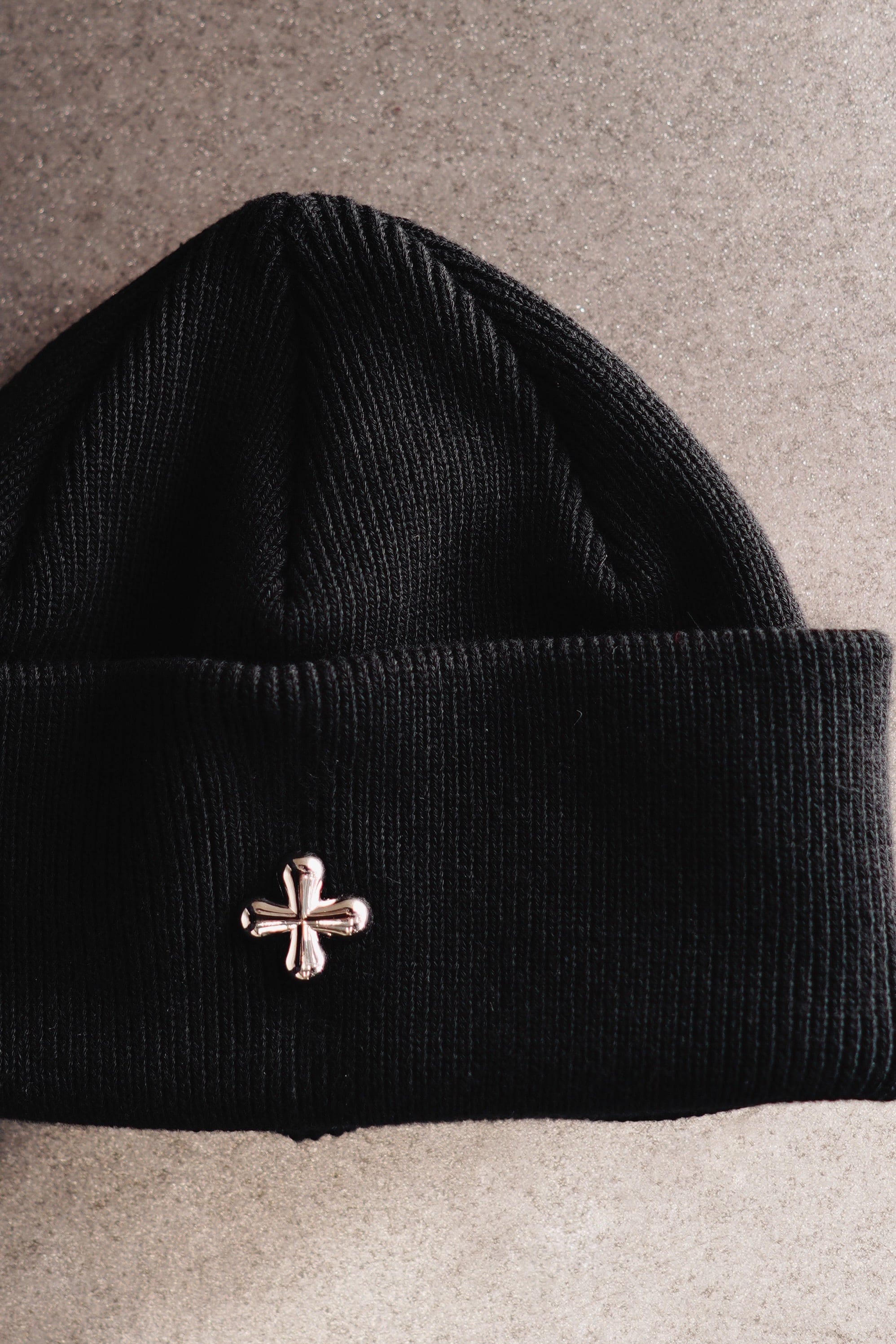 オリジナルのチャームが埋め込まれたニットキャップ