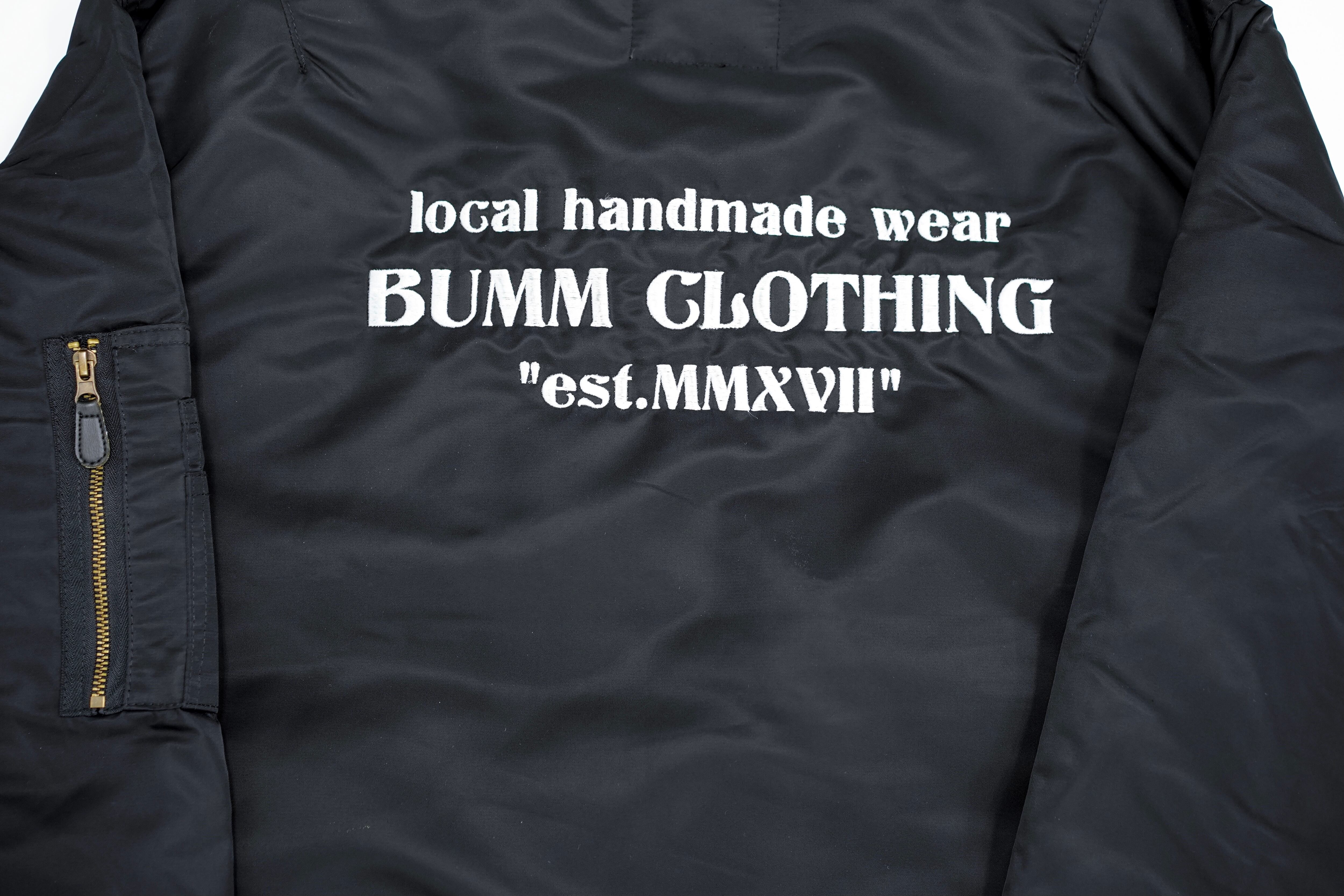 後ろはBUMM CLOTHINGのロゴ、ローマ数字でBUMMが始まった年入り